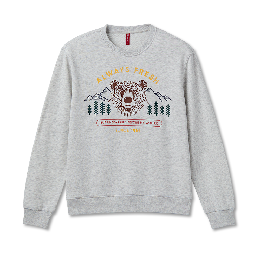 We’re all a little un-bear-able before our daily Tims. Celebrate your love for coffee and Canada with this stylish. French terry bear crewneck. Perfect for breakfast runs. the gym or a cozy day at home. this unisex style in grey marl is a must-have for coffee lovers.